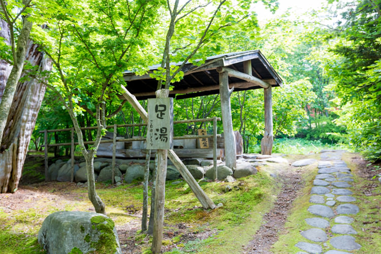 湯浴みの後に、食事の前に、のんびりと散策を愉しみたい方のために、一周一時間程度の散策路を整備いたしました。若葉が芽吹く新緑の季節から、一面銀世界の季節まで、四季折々の風景を満喫していただけることと思います。 小川が流れる庭園、彩りを映す池、九万坪の敷地内を悠然と流れる落部川、どこか懐かしい吊り橋、樹齢千年を越えるイチイの大樹、三十五トンの巨石をくりぬいた野天風呂、夫婦岩、ばったり、つつじ、遥か連なる山々…。